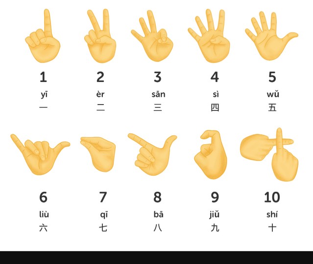 1 yī, 2 èr, 3 sān, 4 sì, 5 wǔ, 6 liù, 7 qī, 8 bā, 9 jiǔ, 10 shí
